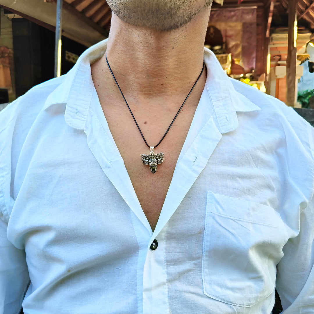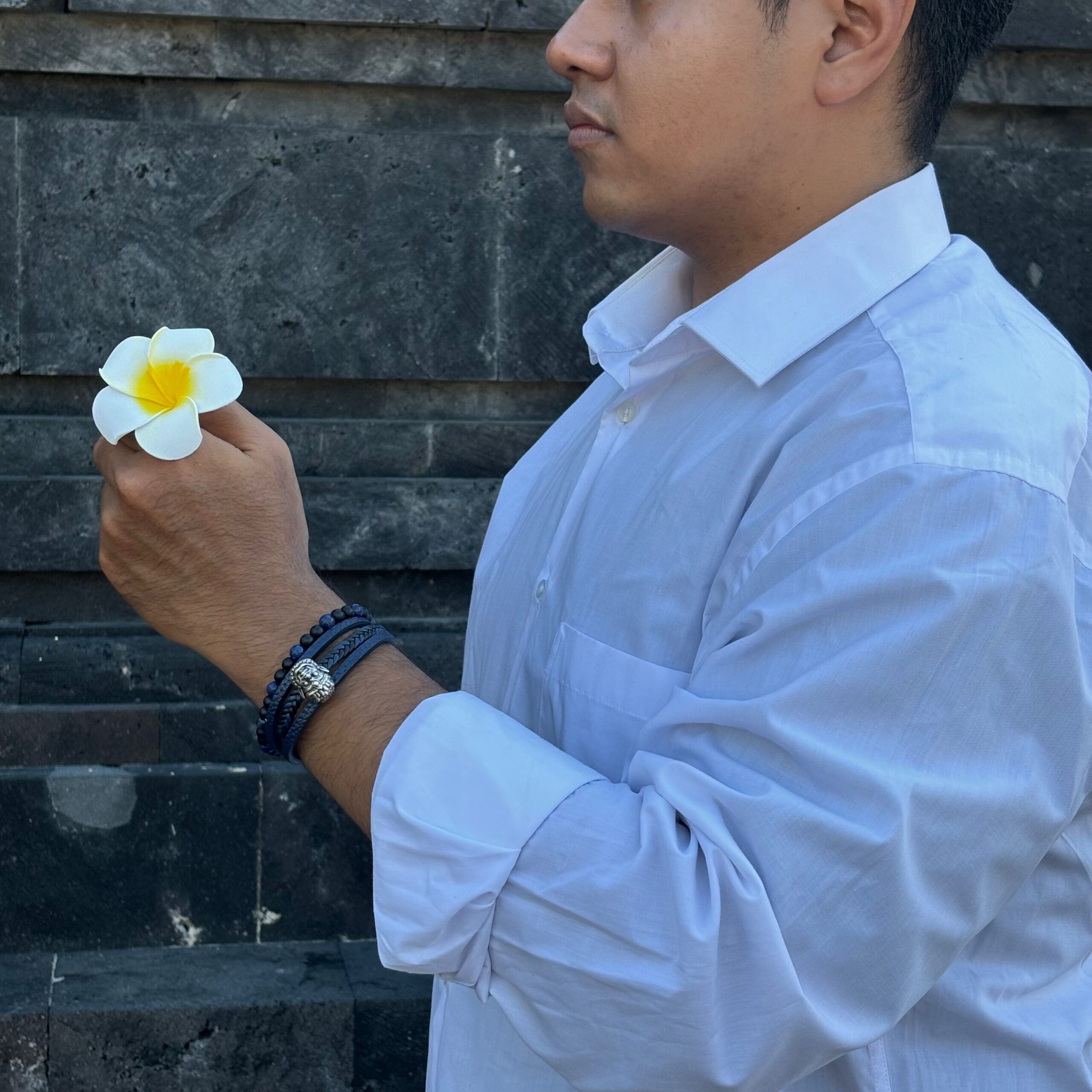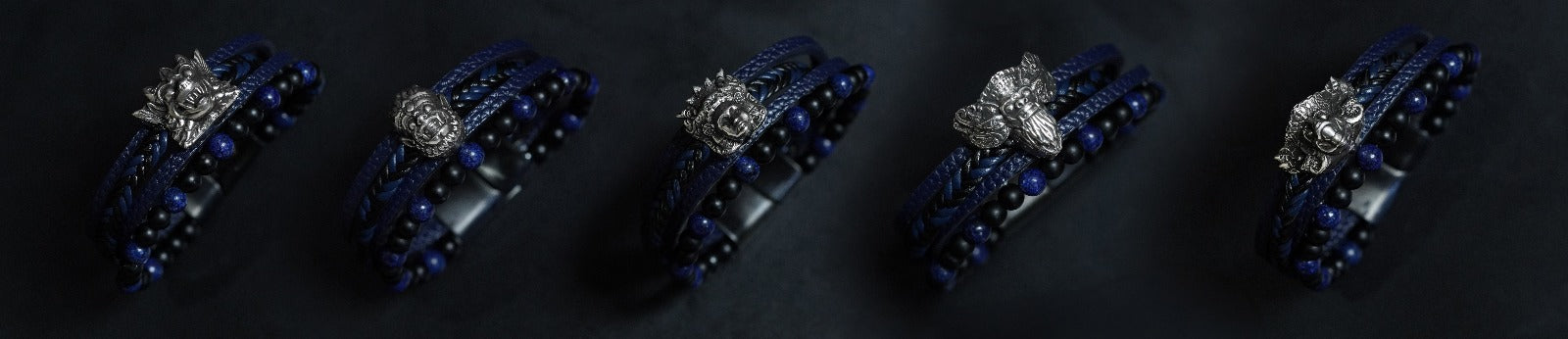 Handcrafted in silver and mounted on deep-blue recycled leather, each design reflects the soul of its Balinese guardian.